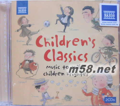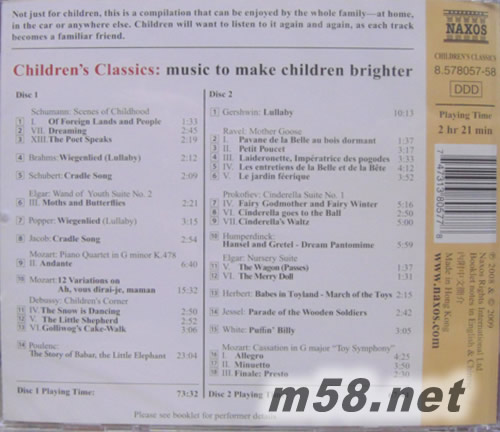 Children’s Classics: Music to make children brighter兒童古典樂-小小天才選集(m58.net) 這是一套針對孩童所設計的古典音樂合輯,以兩片CD的容量收錄古典音樂中膾炙人口的樂曲。CD1選曲內容以搖籃曲等溫暖曲調作品為主,適合夜晚聆聽,讓兒童輕鬆進入夢鄉。從舒曼的「兒時情景」開始,歡快的「陌生的國度與人們」,以及家喻戶曉的經常被廣告或電影引用的「夢幻曲」;德布西著名的鋼琴組曲「兒童天地」中帶點滑稽幽默色彩的「黑娃娃步態舞」很能吸引目光。莫札特兩首風格截然不同的作品,慢板的鋼琴四重奏曲調優美、活潑的小星星變奏曲都相當動聽。敘述年輕大象巴巴在城市的冒險故事,必定能引起小朋友興趣。布拉姆斯、舒伯特、波佩等搖籃曲,則是伴隨孩童進入夢鄉的最佳催眠樂。 CD2是一片充滿想像與魔法的天地,拉威爾的「鵝媽媽」及普羅高菲夫「灰姑娘」是根據童話故事所譜寫;以燦爛的音樂敘述迷人的故事。格林童話中糖果屋的故事,是從小父母就會說給孩童聽的,洪伯丁克高明的作曲功力,將故事內容活生生跳入我們面前。三首輕鬆活潑的進行曲,為生活帶來更多樂趣;最后以莫札特父親~老莫札特的荒誕的玩具交響曲