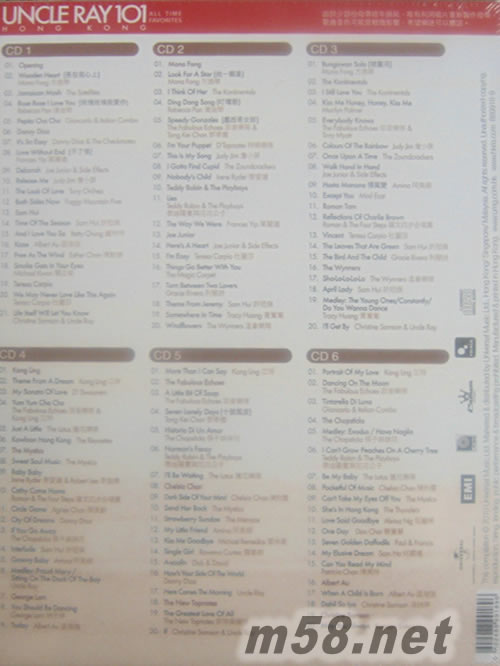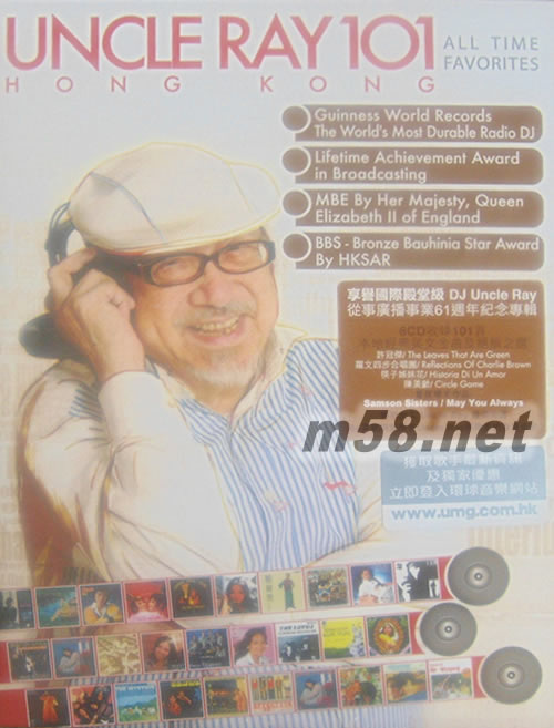 Uncle Ray 101 (6CD套裝)(m58.net) 享譽國際殿堂級 DJ Uncle Ray 從事廣播業61周年紀念專輯 6CD 收錄101首主要六七十年代本地 經典英文金曲及絕版之選 許冠杰/ The Leaves That Are Green 羅文/ Reflections Of Charlie Brown 筷子姊妹花/ Historia Di Un Amor 陳美齡/ Circle Game 首度曝光作品: Samson Sisters / May You Always 特別加入UNCLE親切旁述 64頁歌詞集附有UNCLE與歌星的珍貴合照 極具珍藏價值