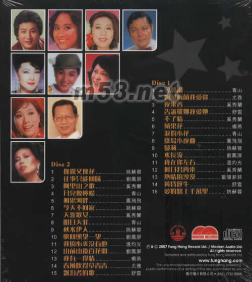 CD.1 01. 尋夢園 -青山 02. 梅蘭梅蘭我愛你 -尢雅 03. 夜來香 -奚秀蘭 04. 告訴羅娜我愛她 -舒云 05. 不了情 -奚秀蘭 06. 蘋果花 -楊燕 07. 淚的小花 -青山 08. 綠島小夜曲 -鳳飛飛 09. 蔓莉 -姚蘇蓉 10. 水長流 -劉鳳屏 11. 我在你左右 -溫灼光 12. 何日君再來 -奚秀蘭 13. 熱情的沙漠 -歐陽菲菲 14. 黃昏放牛 -舒云 15. 愛的路上千萬里 -姚蘇蓉 CD.2 01. 像霧又像花 -姚蘇蓉 02. 往事只能回味 -劉鳳屏 03. 阿里山之歌 -奚秀蘭 04. 月兒像檸檬 -青山 05. 相思河畔 -鳳飛飛 06. 今天不回家 -姚蘇蓉 07. 天涯歌女 -奚秀蘭 08. 明日天涯 -青山 09. 秋水伊人 -姚蘇蓉 10. 快回頭望一望 -劉鳳屏 11. 我的心里沒有他 -溫灼光 12. 山前山后百花開 -劉鳳屏 13. 我有一段情 -楊燕 14. 春風吹得草青青 -尤雅 15. 飄泊者的歌 -舒云