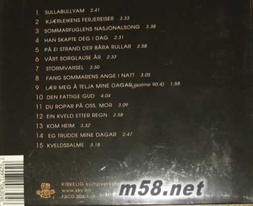 01.SULLABULLYAM 02.KJAERLEIKENS FERJEREISER 03.SOMMARFUGKENS NASJONALSONG 04.HAN SKAPTE DEG I DAG 05.PA EI STRAND DER BAR BARA RULLAR 06.VART SORGLAUSE AR 07.STORMVARSEL 08.FANG SOMMARENS ANGE I NATT 09.LAER MEG A TELJA MINE DAGAR 10.DEN FATTIGE GUD 11.DU ROPAR PATTIGE GUD 12. EIN KVELD ETTER REGN 13.KOM HEIM 14.EG TRUDDE MINE DAGAR 15.KVELLDSSALME