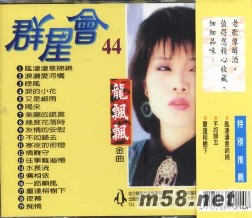 01. 風(fēng)凄凄意綿綿 02. 淚灑愛河橋 03. 晚風(fēng) 04. 淚的小花 05. 又是細(xì)雨 06. 喝采 07. 美麗的謊言 08. 幾度花落時 09. 友情的安慰 10. 不如歸去 11. 寒夜的街燈 12. 情難守 13. 往事難追憶 14. 水長流 15. 倆相依 16. 一路順風(fēng) 17. 重逢榕樹下 18. 夜幕 19. 癡情