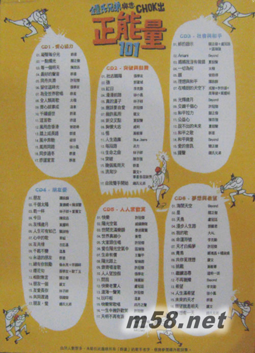 鐘氏兄弟Chok出正能量 101套裝(m58.net) 鍾氏兄弟 (監(jiān)制),音樂(lè)達(dá)人『鍾氏兄弟』自選香港經(jīng)典勵(lì)志歌曲101首6CD 唱好香港‧CHOK 出正能量為港人打氣‧與港人同舟共濟(jì)絕版重現(xiàn)-《凝聚每分光》群星《青鳥(niǎo)》鄭鴻昌、楊淑貞《踏上成長(zhǎng)路》群星,首次曝光-《人人望放假》張學(xué)友《最好的聲音》群星《千禧盛世》群星,久違名字-黃敏華《挑戰(zhàn)》《悟》梁球《風(fēng)中奔馳》赤道《這首歌》威鎮(zhèn)樂(lè)隊(duì)《陽(yáng)光空氣》,滄海遺珠 –《我的歌》大AL《風(fēng)雨念香港》曾路得《胸懷大志》威利