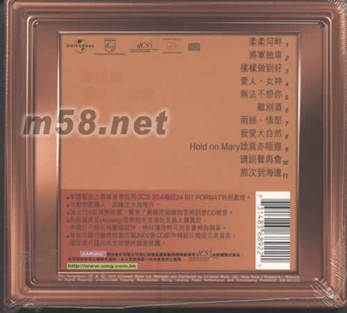 本碟歌曲之原錄音帶采用DCS954機經24BIT FORMAT特別處理 令動態更驚人,訊噪比大為提升。 加上128倍超頻取樣,實現了最精密細致的音頻訊號CD錄間 為保留原音ANALOG母帶的完美音色太最大傳真度,本唱片不經任何壓縮程序,所以播放時可把音量稍為調高。 每卷印模均嚴格限量負責制2000只CD即作報銷以確保完美音色,環球唱片僅此向全球隊樂迷誠意推薦