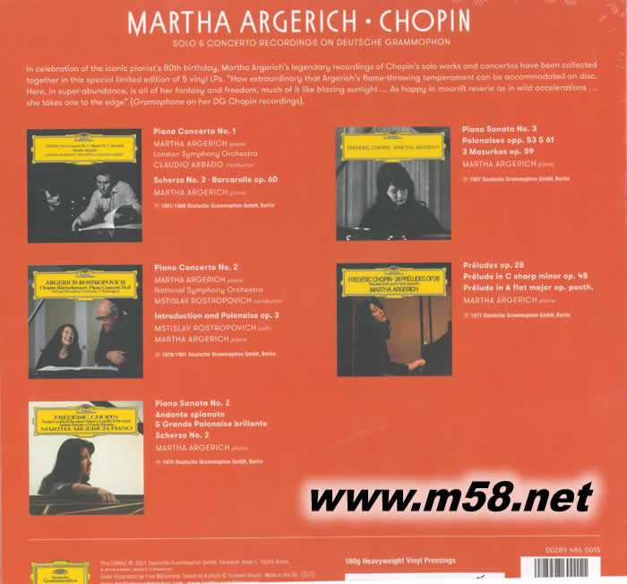 LP1 Frédéric Chopin Piano Concerto No. 1 in E Minor, Op. 11 (Martha Argerich, London Symphony Orchestra, Claudio Abbado) I. Allegro maestoso II. Romance. Larghetto III. Rondo. Vivace Scherzo No. 3 in C-Sharp Minor, Op. 39 (Martha Argerich) Barcarolle, Op. 60 (Martha Argerich) LP2 Frédéric Chopin Piano Concerto No. 2 in F Minor, Op. 21 (Martha Argerich, National Symphony Orchestra Washington, Mstislav Rostropovich) I. Maestoso II. Larghetto III. Allegro vivace Introduction and Polonaise, Op. 3 (Martha Argerich, Mstislav Rostropovich) Introduction. Lento – Alla Polacca. Allegro LP3 Frédéric Chopin Piano Sonata No. 2 in B-Flat Minor, Op. 35 (Martha Argerich) I. Grave – Doppio movimento II. Scherzo – Più lento – Tempo I III. Marche funèbre IV. Finale Andante spianato et Grande polonaise brillante, Op. 22 (Martha Argerich) Andante spianato et Grande Polonaise brillante in E-Flat Major, Op. 22 Scherzo No. 2 in B-Flat Minor, Op. 31 (Martha Argerich) Presto LP4 Frédéric Chopin Piano Sonata No. 3 in B Minor, Op. 58 (Martha Argerich) I. Allegro maestoso II. Scherzo. Molto vivace III. Largo IV. Finale. Presto non tanto Polonaise No. 7 in A flat, Op. 61 Polonaise-Fantaisie (Martha Argerich) Allegro maestoso Polonaise in A-Flat Major, Op. 53 “Heroic” (Martha Argerich) Maestoso 3 Mazurkas, Op. 59 (Martha Argerich) No. 1 in A Minor: Moderato No. 2 in A-Flat Major: Allegretto No. 3 in F-Sharp Minor: Vivace LP5 Frédéric Chopin 24 Préludes, Op. 28 (Martha Argerich) No. 1 in C Major No. 2 in A Minor No. 3 in G Major No. 4 in E Minor No. 5 in D Major No. 6 in B Minor No. 7 in A Major No. 8 in F-Sharp Minor No. 9 in E Major No. 10 in C-Sharp Minor No. 11 in B Major No. 12 in G-Sharp Minor No. 13 in F-Sharp Major No. 14 in E-Flat Minor No. 15 in D-Flat Major No. 16 in B-Flat Minor No. 17 in A-Flat Major No. 18 in F Minor No. 19 in E-Flat Major No. 20 in C Minor No. 21 in B-Flat Major No. 22 in G Minor No. 23 in F Major No. 24 in D Minor Prélude in C-Sharp Minor, Op. 45 (Martha Argerich) Prélude in A-Flat Major, B. 86 (Martha Argerich)