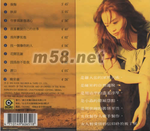 01、后悔 02、秋涼 03、你曾為誰傷過心 04、我喜歡說自己的故事 05、為何夢(mèng)見他 06、找一個(gè)像你的人 07、花開花謝 08、因?yàn)槟悴皇俏?br>09、渡口 10、晚安曲