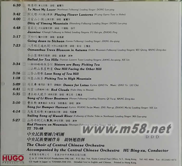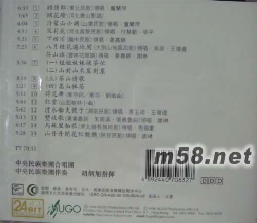 1、曲目介紹 [1] 瞧情郎 6:33 [2] 鬧花燈 3:45 [3] 沂蒙山小調(領唱:董蘭萍) 4:04 [4] 茉莉花(領唱:付慧勤、張平) 4:51 [5] 下四川 5:21 [6] 八月桂花遍地開(領唱:吳瓊、王增道) 7:25 2、茶山謠 [7] I姐姐妹妹采茶忙 II 山對山來崖對崖 3:36 [8] III茶山情歌 3:19 [9] IV嵩山采茶 1:21 [10] 荷花舞 5:11 [11] 紅云 4:44 [12] 澧水船夫號子(領唱:齊玉琦、王增道) 5:42 [13] 豐收歌(領唱:謝琳) 5:13 [14] 烏蘇里船歌(領唱:馬國慶) 4:17 [15] 山丹丹開花紅艷艷(領唱:謝琳)