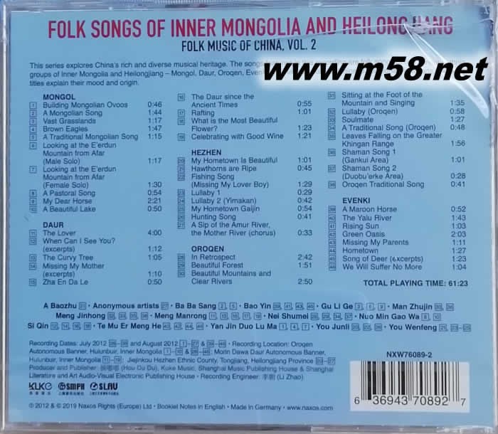 中國民歌集 (2) 內蒙古與黑龍江 蒙古族、赫哲族、達斡爾族、鄂倫春族、鄂溫克族民歌 FOLK MUSIC OF CHINA VOL.2 FOLK SINGS OF INNER MONGOLIA AND HEILINGJIANG(m58.net)