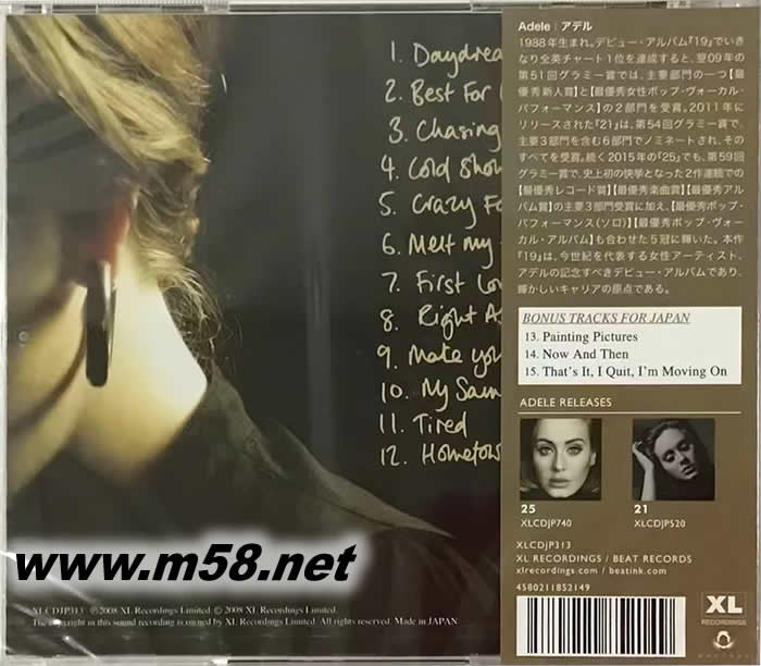 價(jià)格為估,以實(shí)到貨為準(zhǔn)! ADELE 19 日本版(m58.net) 《19》是英格蘭女歌手阿黛爾的首張錄音室專輯,發(fā)行于2008年1月28日。該專輯在英國(guó)發(fā)行首周即登上英國(guó)專輯排行榜首位。阿黛爾憑這張專輯獲得第51屆格萊美獎(jiǎng)最佳新人獎(jiǎng)。2008年,《19》獲第17屆英國(guó)水星音樂(lè)獎(jiǎng)“年度專輯”提名 18歲時(shí),情竇初開(kāi)的阿黛爾·阿德金斯被前男友拋棄,這促使她創(chuàng)作出了這張專輯。她認(rèn)為,這張專輯的歌曲都有比較深刻的主題,這張專輯可以說(shuō)是關(guān)于“一種關(guān)系”的概念專輯;她表示這張專輯的《Daydreamer》是寫(xiě)給初戀男友的;而《Hometown Glory》既是寫(xiě)給初戀男友又是寫(xiě)給她媽媽的。當(dāng)時(shí)她媽媽要求她去倫敦之外的大學(xué)上學(xué),所以阿黛爾·阿德金斯把這首歌作為一首抗議之歌送給她媽媽,而歌詞的靈感來(lái)自于她一次喝醉酒回家的故事 第二主打曲《Chasing Pavements》的靈感來(lái)自于她的一段只有6個(gè)月的戀情。當(dāng)時(shí)她的前男友出軌,所以她來(lái)到酒吧打了男友一拳。她被趕出酒吧后一個(gè)人沒(méi)落地在走在人行道上,獲得靈感創(chuàng)作了這首歌曲;阿黛爾·阿德金斯也翻唱了鮑勃·迪倫的《Make You Feel My Love》。阿黛爾·阿德金斯將這張專輯命名為“19”。她認(rèn)為,對(duì)于她來(lái)說(shuō),這張專輯代表了她的年齡(阿黛爾·阿德金斯創(chuàng)作這張專輯的時(shí)候只有19歲)。艾格·懷特、吉姆·阿比斯和馬克·容森加盟了這張專輯的制作,除翻唱的《Make You Feel My Love》之外,阿黛爾·阿德金斯參與了所有歌曲的創(chuàng)作 在《19》中,阿黛爾·阿德金斯初出茅廬,歌聲里全是無(wú)所畏懼的青春和不顧一切的付出,這是她少女的19歲宣言。歌曲《Daydreamer》扣人心弦的音樂(lè),訴說(shuō)著一段段令人心碎的故事,伴隨空心吉他傾吐情殤往事;《Best For Last》是一首典型的流行爵士歌曲,精彩的大木貝斯的伴奏和阿黛爾·阿德金斯那驚人的聲音相互默契地游走著;《Chasing Pavements》整首歌橫跨了爵士、藍(lán)調(diào)和流行樂(lè) ,和煦傷感直襲心靈深處,歌曲中透露著一股淡淡的憂傷,副歌中不斷的反問(wèn)句帶著一絲無(wú)奈也帶著一絲篤定,她的唱腔并不幼嫩,混合靈歌的技巧及具爆發(fā)力的演繹,唱功不容忽視;在《Cold Shoulder》充滿動(dòng)感的節(jié)奏中,龐大的交響樂(lè)也開(kāi)始湊熱鬧,氣勢(shì)輝煌中阿黛爾·阿德金斯的聲音時(shí)而爆發(fā),時(shí)而收斂,時(shí)而她運(yùn)用假聲,時(shí)而她運(yùn)用喉音,無(wú)論是音色還是演唱技巧都像極了艾米·懷恩豪斯 在《Crazy For You》這首抒情的慢歌中,說(shuō)阿黛爾·阿德金斯的假聲在為木吉他伴奏一點(diǎn)也不過(guò)分,因?yàn)樵谀炯紤械姆纸庵?,阿黛爾·阿德金斯那極具控制力的聲音幾乎全部奪走了屬于吉他的光彩;在《First Love》中,八音盒般的精靈鍵盤(pán)音色繚繞全曲;《Right As Rain》是一首充滿復(fù)古色彩的爵士歌曲,旋律輕快而優(yōu)美,阿黛爾·阿德金斯就像一位飽經(jīng)風(fēng)霜的爵士名伶,在每一個(gè)小細(xì)節(jié)上都下足了工夫,十分細(xì)膩;《Make You Feel My Love》雖然是一首翻唱之作,但是阿黛爾·阿德金斯好像就把它變成了自己的歌一樣,她用她低沉深厚的嗓音將歌中的深情厚誼演繹得很到位。該曲和她其他歌曲中傳達(dá)的悲傷氛圍不同,這首歌描寫(xiě)了“想要將自己的全部奉獻(xiàn)給所愛(ài)的人”,同時(shí)又因?yàn)椴恢缹?duì)方是否接受而感到內(nèi)心迷茫 [;《Hometown Glory》寂寥鋼琴敲擊出漩渦般的感染力,旋律略顯傷感,情緒失落!