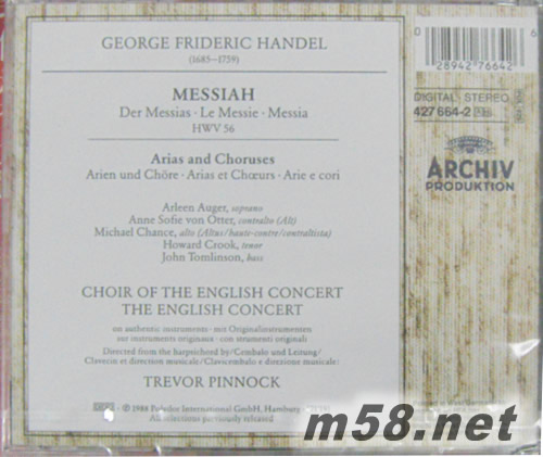 這套《亨德爾:彌賽亞》由Archive唱片公司發(fā)行于1989年,特雷沃•平諾克指揮英國協(xié)奏團(tuán)及合唱團(tuán)演奏錄制。