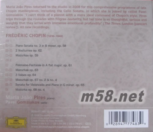 Disc 1: 1. Piano Sonata No.3 in B minor, Op.58 - 1. Allegro maestoso 2. Piano Sonata No.3 in B minor, Op.58 - 2. Scherzo (Molto vivace) 3. Piano Sonata No.3 in B minor, Op.58 - 3. Largo 4. Piano Sonata No.3 in B minor, Op.58 - 4. Finale (Presto non tanto) 5. Deux Nocturnes, Op.62 - 1. Nocturne in B (Andante) 6. Deux Nocturnes, Op.62 - 2. Nocturne in E (Lento) 7. Mazurka No.36 in A minor Op.59 No.1 - Moderato 8. Mazurka No.37 in A flat Op.59 No.2 9. Mazurka No.38 in F sharp minor Op.59 No.3 Disc 2: 1. Polonaise No. 7 In A Flat Major, Op. 61 "Fantaisie" 2. Mazurka No.39 in B Op.63 No.1 3. Mazurka No.40 in F minor Op.63 No.2 - Lento 4. Mazurka No.41 in C sharp minor Op.63 No.3 - Allegretto 5. Waltz No.6 in D flat, Op.64 No.1 -"Minute" - Molto vivace 6. Waltz No.7 in C sharp minor, Op.64 No.2 - Tempo giusto 7. Waltz No.8 in A flat, Op.64 No.3 - Moderato 8. Mazurka No.45 in G minor Op.67 No.2 9. Mazurka No.47 in A minor Op.67 No.4 10. Cello Sonata in G minor, Op.65 - 1. Allegro moderato 11. Cello Sonata in G minor, Op.65 - 2. Scherzo (Allegro con brio) 12. Cello Sonata in G minor, Op.65 - 3. Largo 13. Cello Sonata in G minor, Op.65 - 4. Finale (Allegro) 14. Mazurka No.51 in F minor Op.68 No.4