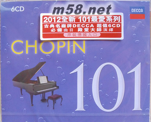 101 Chopin 101肖邦殿堂大師精選套裝 101古典系列6CD套裝(m58.net) 2012全新101最愛系列 古典名廠牌DECCA超值6CD必備曲目,殿堂大師演繹 DECCA唱片官方試聽網址(片段): http://www.deccaclassics.com/cat/single?sort=newest_rec&PRODUCT_NR=4783648&SearchString=101&per_page=50&flow_per_page=50&presentation=flow&UNBUYABLE=1