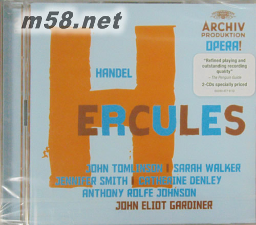 神劇《赫丘力士》是韓德?tīng)?720年的作品,故事就是描寫(xiě)這個(gè)希臘神話中的大力士與狄亞妮拉公主之間的故事,賈第納出色的以古樂(lè)器表現(xiàn)出韓德?tīng)栕髌防锏幕盍εc自然的戲劇效果。約翰‧湯姆林森演唱的「赫丘力士」是一個(gè)深沉的絕佳典范;而莎拉‧沃克飾演的「狄亞妮拉公主」,可說(shuō)是全劇最具熱情的演出。精致的演奏再加上出色的錄音,讓整體效果相當(dāng)迷人。