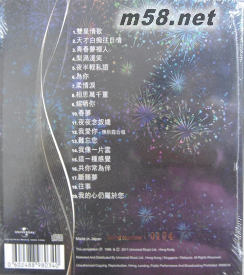 01. 雙星情歌 02. 天才白癡往日情 03. 青春夢里人 04. 梨渦淺笑 05. 夜半輕私語 06. 為你 07. 柔情淚 08. 相思萬千重 09. 錫曬你 10. 春夢 11. 夜夜念奴嬌 12. 我愛你 13. 難忘您 14. 我像一片云, 15. 這一種感覺 16. 共你常為伴 17. 斷腸夢 18. 往事 19. 我的心仍屬于您
