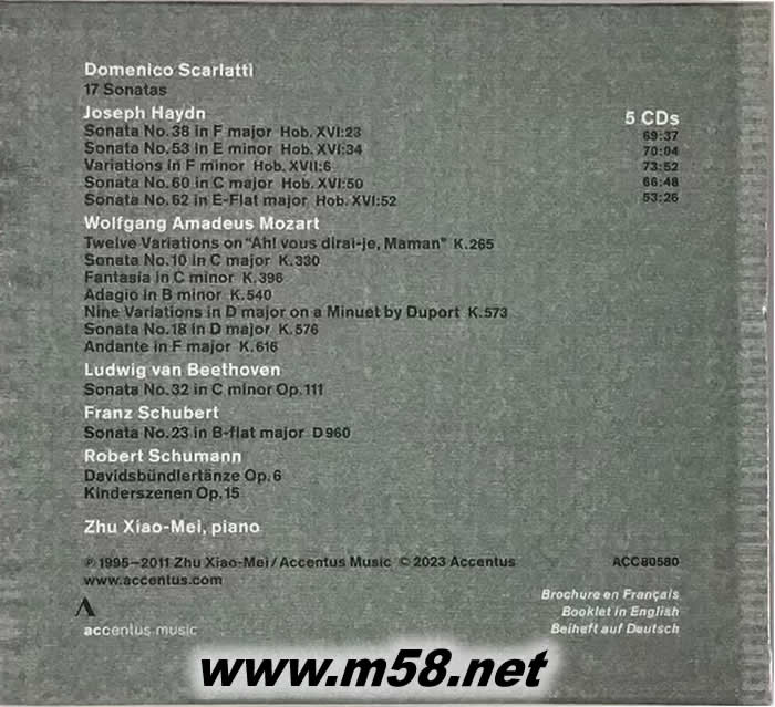 價格為估,以實到貨為準! 經典鋼琴 5CD套裝(m58.net) 最好的演奏讓人忘記時間,忘記自我” ~ 南方都市報 “古典音樂是一輩子的追求和熱愛,用心感受,傳遞上帝的聲音,才是鋼琴家的使命。以出人頭地為目的,以掙錢為目標,手下的音樂怎么保持純潔和心誠?即使上升到這個高度,朱曉玫也是中國鋼琴家的榜樣和旗幟。” ~ 張克新 朱曉玫在古典音樂界占有重要地位,尤其是她對巴赫音樂的寶貴詮釋。這套CD專輯收錄了斯卡拉蒂、海頓和莫扎特以及貝多芬、舒伯特和舒曼為鋼琴家創作的重要作品。這些錄音證明了她通過獨特的藝術眼光和對音調的敏感度來表達各種風格和時代的能力。它們錄制于 1995 年至 2011 年之間,這些已經絕版多年的專輯,首次重新以6位作曲家5CD套裝發行,樂迷不容錯過。 朱曉玫錄制的唱片主要包括巴赫作品《平均律鋼琴曲全集》、《哥德堡變奏曲》、《帕蒂塔作品集》、《賦格的藝術》以及由ACCENTUS MUSIC在萊比錫圣托馬斯教堂錄制的2014年萊比錫巴赫音樂節的演出實況DVD《哥德堡變奏曲》。其他唱片有斯卡拉蒂、海頓、莫扎特、貝多芬、舒曼、舒伯特的作品。《賦格的藝術》面市不久便獲法國2014年度震撼唱片大獎。同時,朱曉玫的唱片巴赫《創意曲》、《哥德堡變奏曲》由ACCENTUS MUSIC出版發行。有關朱曉玫和巴赫的紀錄片《一位中國鋼琴家與巴赫》獲第33屆蒙特利爾藝術電影節最佳散文影片大獎。"