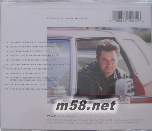 When Love Finds You(美版)(m58.net) 第三十五屆格萊美(1993)最佳鄉(xiāng)村男藝人 vince gill(文斯·基爾),1957年4月12日出生于美國奧克拉荷馬州的諾曼(Norman),原名文斯·格蘭特·基爾(Vince Grant Gill)。他的父親是一名聯邦法官,會彈班卓琴?;鶢?0歲開始學習吉他,上中學時就參加過當地一支叫"山霧"(Mountain Smoke)的鄉(xiāng)村搖滾樂隊。中學畢業(yè)后,他得到高爾夫運動員獎學金,到肯德基州的路易斯維爾(Louisville)上大學,很快便參加了一支叫"南方聯盟"的樂隊。此時他除了會彈奏吉他外,還會演奏曼陀林、小提琴和班卓琴。1979年,基爾來到納什維爾并很快的成了音樂節(jié)上的紅人。1984年,他的歌曲第一次進入鄉(xiāng)村歌曲排行榜前40 名。此后,他的歌曲不斷地在排行榜上取得佳績。 進入90 年代,基爾留下了輝煌的足跡,除了錄制唱片外,他還是音樂會上的十大明星之一,兩次獲得鄉(xiāng)村音樂協會的最佳藝人獎。他說:"我希望有人記住我,我曾經關心過鄉(xiāng)村音樂的完整性。我也喜歡當演員、當作曲家、做事業(yè)。同樣,我關心歷史,它從什么地方開始,他往哪兒發(fā)展。" vince gil的演唱娓娓道來,讓人觸動內心心弦,值得用心去揣摩,去細細聆聽.
