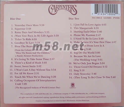 DISC 1: 1. Yesterday Once More 2. Superstar 3. Rainy Days And Mondays 4. Back In My Life Again, (Want You) 5. Ticket To Ride 6. Goodbye To Love 7. Bless The Beasts And The Children - (from "Bless The Beasts And The Children") 8. It's Going To Take Some Time 9. There's A Kind Of Hush 10. Sweet, Sweet Smile 11. I Won't Last A Day Without You 12. For All We Know - (from "Lovers And Other Strangers") 13. Touch Me When We're Dancing 14. Calling Occupants Of Interplanetary Craft (The Recognized Anthem Of World Contact Day) DISC 2: 1. I Just Fall In Love Again 2. This Masquerade 3. Hurting Each Other 4. Please Mr. Postman 5. I Need To Be In Love 6. Make Believe It's Your First Time 7. All You Get From Love Is A Love Song 8. Top Of The World 9. Because We Are In Love (The Wedding Song) 10. We've Only Just Begun 11. Those Good Old Dreams 12. Sing 13. Only Yesterday 14. Close To You, (They Long To Be)