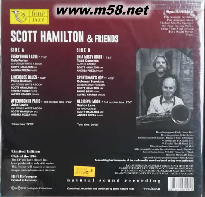 [史考特 漢彌頓與友人們]Scott Hamilton & Friends 薩克斯四重奏 黑膠(m58.net) Scott Hamilton (薩克斯管) Paolo Birro (鋼琴) Andrea Pozza (鋼琴) Alfred Kramer (鼓) 1. 來自美國的薩克斯管天王史考特.漢彌頓(Scott Hamilton)以獨特鮮明的吹奏風格,吹奏音色迷人,予人一種無限遐想空間感覺,充滿魅力地吸引無數樂迷,他最擅長吹奏中音薩克斯管(tenor saxophone),被視為此樂器的完美吹奏者之一。