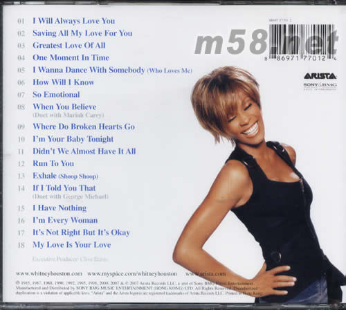 這一張2007年所發行的【永恆情歌極精選】,精選18首惠妮歌唱生涯至今在不同時期最具代表性的情歌經典,無論是節奏輕快、充滿愛情期待的「I Wanna Dance With Somebody (Who Loves Me)」「How Will I Know」;深情讓人動容的的抒情經典「I Will Always Love You」「Saving All My Love For You」「I Have Nothing」「Run To You」,或是與瑪麗亞凱莉雙后合璧為動畫【埃及王子】破天荒合作的「When You Believe」,以及和天王喬治麥可驚艷合唱的節奏舞曲「If I Told You That」,這些百萬單曲都是惠妮最精采的情歌精選。