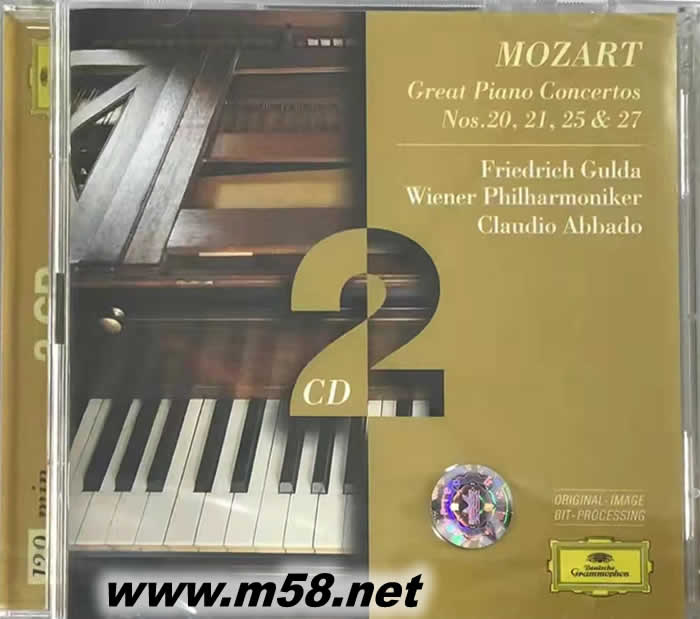 AClaudio Abbado & Friedrich Gulda - Mozart: Piano Concertos No.21 25 & 27(m58.net) 這款《莫扎特:No.20 & 21 & 25 & 27鋼琴協奏曲》是黃金組合——弗里德利希·古爾達獨奏,阿巴多指揮維也納愛樂樂團協奏于1997年在DG公司旗下灌錄的錄音。 莫扎特的創作手法新穎,旋律純樸優美,織體干凈細致,配器注重音色效果,發揮了復調音樂的積極作用,對后世音樂創作產生極大的影響。他在短促的一生中共創作了75部作品,留下了《費加羅的婚禮》、《唐璜》、《后宮誘逃》、《魔笛》等著名歌劇,使歌劇成為具有市民特點的新體裁,并作有大量交響曲、協奏曲、鋼琴曲和室內樂重奏。 在所有的樂器中,莫扎特對鋼琴最為鐘愛,他也為鋼琴作了大量的樂曲。在這其中,27首鋼琴協奏曲的創作貫穿了他的一生,從他11歲創作的第一首鋼琴協奏曲到他辭世那年的最后一首記錄著莫扎特在音樂上的成長軌跡:由早期的改編模仿到逐步探索,到最終形成獨一無二的莫扎特風格。在鋼琴協奏曲的歷史上,是莫扎特采用交響手法使獨奏同樂隊齊奏保持平衡,并且把戲劇性的對比和歌唱性的技藝結合在一起。莫扎特的鋼琴協奏曲是其器樂協奏曲的精華,齊奏聲部和獨奏聲部的和諧平衡達到完美的境界。像他的其他體裁的作品一樣,雖無激烈緊張的矛盾沖突,但卻充滿了戲劇性的對比、出人意料的轉換、不同感情的對照。無論在藝術反映速度的敏捷上,還是在驟然產生的意境的明確以及急劇轉換的形象的清晰上,他的鋼琴協奏曲都是十八世紀即興表演藝術的精華所在。 在莫扎特所有協奏曲中,這首完成于1785年2月10日的第20號作品,最受浪漫樂派作曲家喜愛。它表現出的騷動不安及抒情風格,讓十九世紀人視莫扎特為前浪漫樂派的革命先鋒,也是貝多芬及其他突顯自我風格的音樂巨人之先驅。但如果不以十九世紀的觀點,而以獨特的純熟技巧與集當日音樂風格之大成等特色來評斷莫扎特的音樂,這首作品確實是革命之作,與莫扎特先前任何一首協奏曲相比,無論是嚴肅性或主觀性,都大不相同。從此曲開始,莫扎特在兩年之內,以同樣的形式創作出六首杰作,在器樂作曲上攀上另一座新的高峰。 莫扎特的《C大調No. 21鋼琴協奏曲》創作于1785年,同年在維也納的克魯克劇場首演,并由作者本人擔任鋼琴主奏。本曲那進行曲般雄壯的開曲氣氛,以及充滿奔騰般詼諧精神的終樂章,還有中間樂章始終優美如歌的行板,都體現了這位音樂天才的妙筆。不僅如此,本曲還充分體現了主奏者的鋼琴演奏技巧,但并非純粹的“炫技之作”,并且以莫扎特獨有的那種無可比擬的均衡感,使得聽眾根本找不出管弦樂與主奏樂器(鋼琴)之間不協調的絲毫破綻,這是無可爭議的事實。 克勞迪奧?阿巴多(Claudio Abbado,1933-)生于意大利米蘭,父親是米蘭威爾第音樂學院的小提琴家兼教師,母親是鋼琴家。自威爾第學院畢業后,阿巴多1956年赴維也納音樂學院專修指揮(與祖賓?梅塔同學),兩年后首次登臺即獲成功,同年并獲“庫塞維茨獎”,1962年又獲“米屈風普洛斯國際指揮競賽獎”,并由此而獲得資格進入紐約愛樂樂團成伯恩斯坦和喬治?塞爾的助手??ɡ瓝P聽了阿巴多在柏林的指揮后,邀其參加1965年薩爾茨堡音樂節指揮馬勒第二交響曲,從此聲譽鵲起,同年起指揮米蘭斯卡拉歌劇院,1968年升任常任指揮,1971年再升藝術監督,掌握了這個世界數一數二的歌劇院。這一年,阿巴多還有幸被任命為維也納愛樂樂團首席指揮,次年又受聘為倫敦交響樂指揮,1982年又出任芝加哥交響樂團首席客座指揮。1977年阿巴多還創建歐共體青年管弦樂團(后改名為歐洲室內樂團)并擔任音樂總監。最終,當卡拉揚于1989年逝世,阿巴多在眾多競爭者中脫穎而出,接管了柏林愛樂團。 鋼琴家弗里德里希?古爾達(Friedrich Gulda)生于1930年,從1937到1942他在帕佐夫斯基門下學琴,后來進入維也納音樂院向塞爾德霍費學鋼琴與約瑟夫?馬克斯學作曲理論,在贏得1946年日內瓦國際鋼琴大賽第一名之后,他開始在瑞士、匈牙利、意大利與捷克等地展開演奏會生涯,1950在卡耐基廳首演。不久后他在巴赫、貝多芬、莫扎特與舒伯特等曲目上獲得國際性的贊譽,常常巡回演奏全本貝多芬鋼琴奏鳴曲,也在1968年錄下它。后來他漸漸往爵士樂發展,從那時候起,他常在他的古典音樂聽眾面前附加演奏爵士樂。身為一個古典音樂鋼琴家,古爾達的演奏以富感性的詮釋著名,是極富天賦的一種表現。