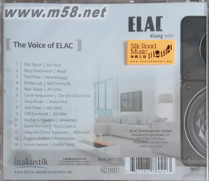 以專門製作高質素音箱見稱的”ELAC(意力)”於1926年在德國的基爾(Kiel)成立,有接近90年的長久歷史,是一間勇於創新,走進時代尖端的音響器材設計和製造公司。公司成立時是以開發和拓展聲納技術(sonar technology)為主,但在1945年二次世界大戰后因市場的需要轉移生產縫紉車和收音機,是公司製造的產品首次與音頻(audio)有關。1948年研發出首臺黑膠唱盤PW1在推出市場后迅即成為唱盤中的翹楚,亦奠定了ELAC在音響界崇高地位。1980年代前期開始,公司開拓和生產高級「發燒」器材,而揚聲器是其中一個主要的發展項目,因其產品的性能表現卓越,很快成為追求至美音效的「發燒友」所心儀的器材之一。在過往的十多二十年,ELAC的產品不斷地創新和改進,緊貼市場的需求和改變,亦曾獲得多個重要的國際音響有關的獎項,因此成為音響界中的一個極具威望的廠牌。因揚聲器在整個音響系統當著重要角色,鑑定音準和真實重播必定要經由它發揮最高性能表現才能達致最理想的音響效果。”ELAC(意力)”揚聲器的特性是音色晶瑩剔透,動力十足,獨特中充滿魅力,重播真確性極高,這些優質的表現,必須由清澈明亮、解像度高的優秀錄音才可將極級器材的性能完美地呈現。現由以專業製作及代理高質錄音音效產品而獲發燒樂迷一致推崇的著名德國品牌in-akustik為配合宣傳和推廣這德國出類拔萃的揚聲器,精心挑選了14首由旗下最高質、最具代表性的歌星演繹旋律極為動聽的經典名曲,加上每首歌曲的錄音效果皆令人完全信服,著意地以這些廣獲好評的錄音凸顯這名牌揚聲器優越過人的特質,塑造出一張主題明確、音效突出的鑑聽必然之選。,這些歌曲包括: