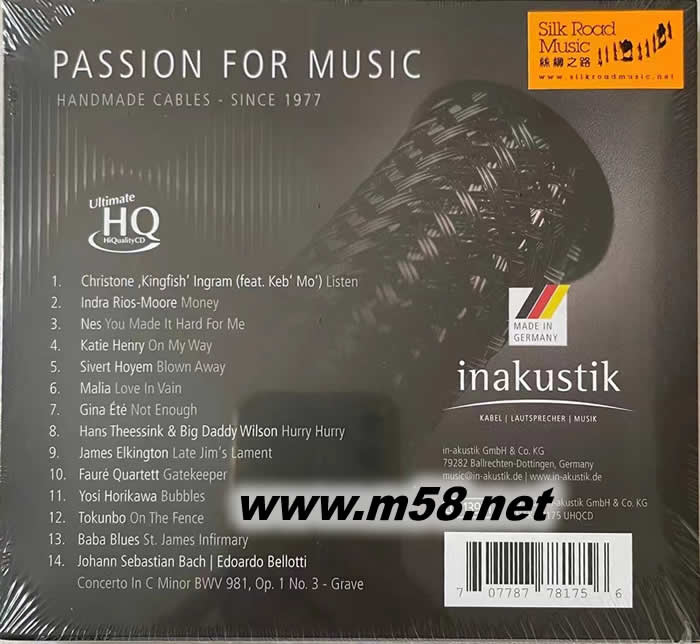 價格為估,以實到貨為準! 線王-音樂的熱誠 Passion For Music inakustik UHQCD(m58.net) 1. 從1977年開始,有線王之稱的德國“原音”公司(in-akustik)以制造高質素的專業音響接線馳名于世,同時其錄音制作亦以極高嚴格要求見稱,軟、硬體產品經常有緊密及互動性的活動和項目以配合市場宣傳推廣的目的,冀能得到相得益彰的效果。 2. 繼‘線王-聲效鑑試盤(in-akustik Soundcheck)’和‘音準對比測試鑑聽(Reference Sound Check)’兩張鑑試專輯獲得空前成功,口碑載道,“德國原音”再接再厲,精心炮制最新一輯鑑聽盤‘線王-音樂的熱誠(Passion For Music - inakustik)’以提供追求完美音質和音效的“發燒友”用作測試其音響設備特別是導線的表現,同時亦能欣賞令人回味無窮的美麗樂曲。 3. 專輯精挑了十四首錄音技術優異,演唱和演奏者表現出色,旋律優美的樂曲。這些樂曲同時亦能鑑聽和測試器材設備的中、高、低音,空間感,解像度,動態范圍,音場的平行和人聲及各種樂器聲的表現和效率等,但音樂欣賞價值極高。 4. 先進優秀的錄音技術,配合自然真實,極高水平的演唱和演奏,這鑑定盤是科技與藝術的優越之作。加上以45轉180克雙黑膠盤為載體,直刻金屬母盤(Direct Metal Mother)由發燒界另一巨擘“老虎魚”負責制作,展現前所未有的聲音美感,效果更趨完美。