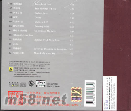 01. 愛的箴言 Proverbs of Love 02. 真感情 True Feelings of Love 03. 新不了情 Endless Love 04. 渴望 Desire 05. 午夜0:03 Midnight 0:03 06. 風兒輕輕吹 Breezing Wind 07. 睡吧!我的愛 Go to Sleep,My Love 08. I Honestly Love You 09. 秋風夜雨 Autumn Wind,Night Rain 10. Misty 11. 河邊春夢 Riverside Dreaming in Springtime 12. 天頂的月娘 Moon Lady in the Sky