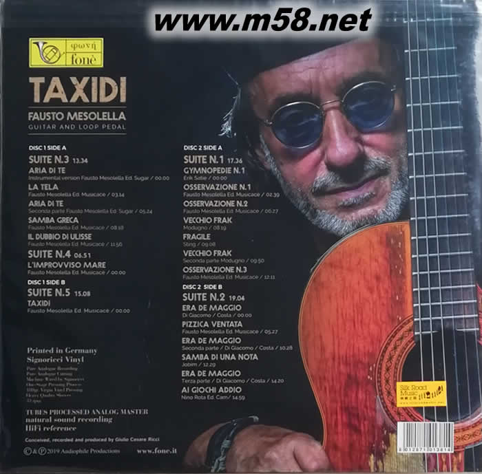 浮士托.梅索萊拉 [旅程] Fausto Mesolella [Taxidi] 黑膠(m58.net) 2016年10月著名意大利結他演奏家浮士托.梅索萊拉(Fausto Mesolella)匯同傳奇錄師里茲(Giulio Cesare Ricci)於意大利塞美芳蒂史科圖古堡酒店(Hotel II Castello - Palazzo di Scoto di Semifonte)的酒窖內進行錄音,所得結果是音效清晰,音像細致鮮明,堂音飽滿,音質真實有勁,聲音更為精準。 2. 梅索萊拉以其出神入化的指彈技巧情心地演繹五首他嘔心瀝血創作和改編的結他組曲,血脈相連般的演繹,充滿詩意,音色綻發著迷人的華彩,將樂曲原來獨特的風貌與神韻及他自己的藝術和靈魂表達得淋漓盡致,亦象徵了他一生絢爛的音樂「旅程」。 3. 在專輯內梅索萊拉採用木結他與循環踏板(loop pedal)演奏但配合得天衣無縫,精致清晰,充滿動力的音質由大師級錄音師里茲(Giulio Cesare Ricci)以優異技術和器材配合創造出來,精湛工藝,臻美淬鏈。 4. 專輯分別以SACD,音色清甜,高透明度,音質堅實有勁,音場開闊,音像定位明確,是試音必備之選。與及24K金(24K Gold)CD為載體,此載體被認為是音訉重播的表現出色準確,失真率低,聲音純凈自然和真實,是「發燒」樂迷的寵愛,全球限量496張,彌足珍貴。
