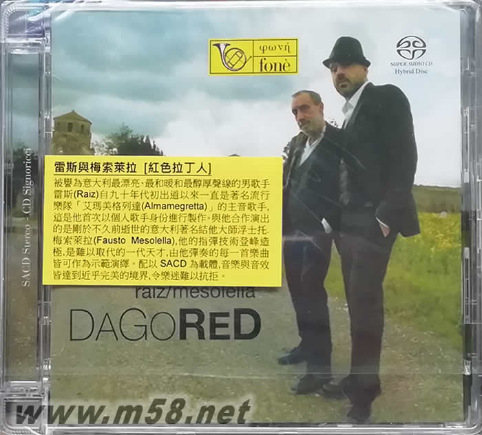 雷斯與梅索萊拉 [紅色拉丁人]Raiz & Fausto Mesolella [Dago Red] SACD(m58.net) Performer : Fausto Mesolella (chitarre, loops e pedal bass)、 Raiz (voce )& Various 已故的結(jié)他大師Fausto Mesolella +意大利男歌神Raiz 一個可一不可再的錄音,「樸質(zhì)音色錄音(natural sound recording)」制式制作 Selling point : 1. 被譽為意大利最漂亮、最和暖和最醇厚聲線的男歌手雷斯(Raiz)自九十年代初出道以來一直是著名流行樂隊「埃瑪美格列達(Almamegretta)」的主音歌手,專輯<紅色拉丁人(Dago Red)>是他首次以個人歌手身份進行制作,是他歌唱實力的試金石。 2. 與雷斯合作演出的是剛于不久前逝世的意大利著名結(jié)他大師浮士托‧梅索萊拉(Fausto Mesolella),他的指彈技術(shù)登峰造極,是難以取代的一代天才,由他彈奏的每一首樂曲皆可作為示范演繹。 3. 兩位大師初度合作所產(chǎn)生的火花奪目耀眼,每首歌曲都是睿智、成熟和深邃的合成體,充滿詩意,人聲和樂器聲融合所發(fā)放著的音色綻發(fā)出迷人的華彩,是稀有難得的發(fā)聲藝術(shù)品。 4. 殿堂級錄音師利茲(Giulio Cesare Ricci)采用最頂級的器材,精巧的技術(shù),以他所創(chuàng)的「樸質(zhì)音色錄音(natural sound recording)」制式制作,別具個人風格與吸引力,配合以SACD為載體,音樂與音效皆達到近乎完美的境界,令樂迷難以抗拒。