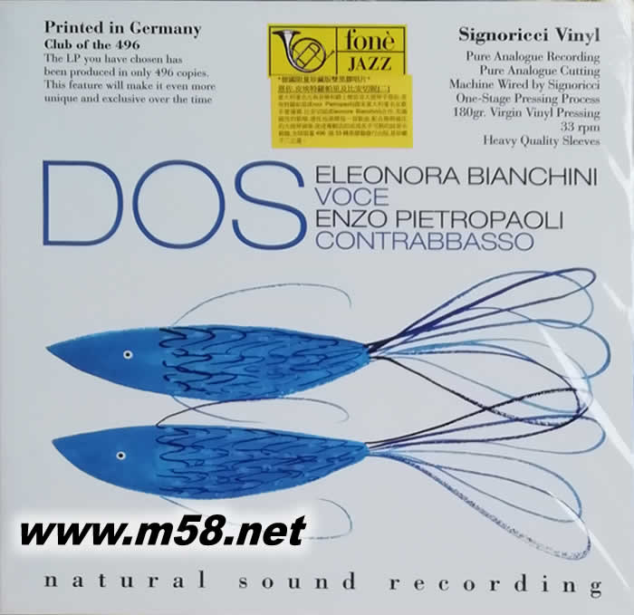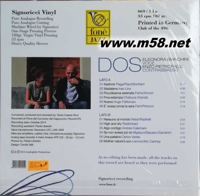 恩佐.皮埃特羅帕里(Enzo Pietropaoli)是意大利著名古典音樂和爵士樂低音大提琴手。在三十年的職業生涯,他到過歐洲、北美和南美、亞洲和非洲表演。他曾與頂尖爵士樂大師如約翰•阿伯克龍比(John Abercrombie), 派特.麥席尼(Pat Metheny), 約翰•斯科菲爾德(John Scofield), 肯尼•克拉克(Kenny Clarke), 比利•科巴姆(Billy Cobham)等合作。皮埃特羅帕里(Enzo Pietropaoli)最新專輯[二(Dos)]請來意大利著名女歌手愛蓮娜.比安切妮(Eleonora Bianchini)合作。比安切妮畢業於著名的波土頓柏克理音樂學院(Berklee College of Music)。她的演唱風格有不同的南美韻味,而她的歌聲予人溫馨迷人的感覺,音樂表現形式獨特。除了意大利歌曲皮埃特羅帕里還選錄了三首經典流行曲,分別是齊柏林飛船(Led Zeppelin)、電臺司令(Radiohead) 和披頭四樂團(The Beatles) 的歌曲。比安切妮充滿磁性的歌喉,感性地演繹每一首歌曲, 配合皮埃特羅帕里無與倫比的大提琴演奏,使這專輯迅即成為炙手可熱的試音示范盤, 分別以SACD及全球限量496 張33轉黑膠盤發行出版,是珍藏不二之選。專輯內歌曲包括: