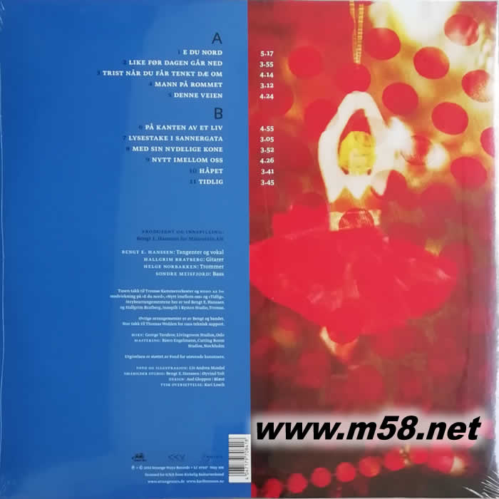 Og Sa Kom Resten Av Livet 玫瑰詩篇 黑膠(m58.net) 發燒天后玫瑰仙子Kari Bremnes三年來首張新錄音專輯,伙拍其樂隊演繹多首創作作品,以充滿詩意的旋律及感染力的歌詞帶出十一首美麗樂章,Kari Bremnes晶瑩暖和的歌聲像說故事道出生活上的美好時刻,挪威的鄉土美事。