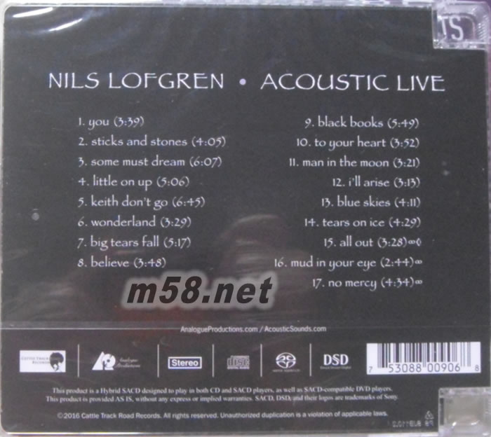 尼爾斯.洛夫格林SACD ,專輯是1997年1月在維也納Barns Of Wolftrap俱樂部中錄下的現場演出。一場不插電的饗宴,Nils的木吉他簡直令人下巴脫臼,洗盡鉛華的編曲使他的嗓音有更貼近人心的表情,音質也好得要命。美國TAS發燒主編>、<唱片圣經主編劉漢盛>及<發燒天碟 朱緯>三大發燒音響主編力薦!