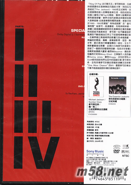 THE ONE DVD(臺灣版)(m58.net) ●榮獲5項葛萊美獎的最大贏家 - 碧昂絲Beyonce、嘻哈教母蜜西艾莉特Missy Elliot、王牌製作人昆西瓊斯Ouincy Jones、夏奇Shaggy、吉兒史考特Jill Scott等巨星齊聲禮讚麥可! ●中文字幕,並收錄多場麥可現場表演實況及新歌「One More Chance」 MV! [King Of Pop流行樂天王]麥可杰克森,五歲時便展露他在音樂舞蹈方面的才華,與四位兄長組成了The Jackson5,1969年正式單飛,自此便展開他傲人的輝煌音樂生涯。他的成就包括個人擁有37首Top10單曲、獲得12座葛萊美獎等最高榮譽,樂界分別代表樂迷與樂評的兩大音樂協會--全美音樂獎與葛萊美獎,都曾分別于1989、1993年頒發“特殊成就獎”及“當代傳奇獎”給麥可,就連雷根、布希與柯林頓,連續三屆美國總統都對他在音樂與社會的貢獻與成就給予高度肯定。麥可是一位不斷創造新風潮及不斷超越自己所立下的里程碑樂壇巨星,在樂界樹立無遠弗界的影響力及卓越貢獻,無論他的歌曲、專輯、音樂錄影帶、造型、舞步等,都已是流行樂壇發展的一部份,生生不息影響著后生晚輩。此張DVD為麥可的音樂生涯做了一很好的整理與回顧,包括今年榮獲5項葛萊美獎最大贏家--碧昂絲Beyonce、嘻哈教母蜜西艾莉特Missy Elliott、王牌制作人昆西瓊斯Ouincy Jones、夏奇Shaggy、吉兒史考特Jill Scott都來談談他們心目中的超級巨星--麥可杰克森。并有多場麥可珍貴的現場表演實況及新歌“One More Chance”的MV。喜愛麥可的樂迷千萬不能錯過這張珍貴的音樂紀錄片。