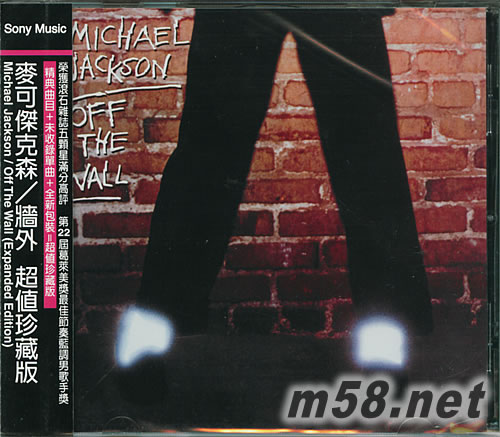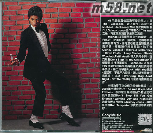 墻外 OFF THE WALL(臺灣版)(m58.net) 68年底由五位活潑可愛的黑人小孩The Jacksons 走上舞臺,其中主唱Michael Jackson自79年首次與超級製作人Quincy Jones合作專輯Off The Wall之后,再度開創演藝事業第二高峰。 Michael以寬廣而富磁性的嗓音,融合搖滾、節奏藍調、靈魂樂,使得專輯的架構堅實有力,獲得滾石雜誌五顆星滿分高評價。專輯製作陣容堅強,除了有Quincy Jones外,尚有Paul McCartney、David Foster、Larry Caelton、Stevie Wonder及Patti Austin等人共同參與。首支單曲Don’t Stop Till You Get Enough不僅爬昇排行冠軍寶座,Michael亦以這首單曲榮獲第22屆葛萊美獎最佳節奏藍調男歌手獎項;第二支單曲Rock With You亦蟬連4週冠軍,不慍不火旋律,讓人隨著節奏任意搖擺,此外,Working Day And Night、Off The Wall等均是值得推薦的佳作。 本輯為麥可迷必備的超值珍藏版,在2001年全新發行Off The Wall (Expanded Edition) 收錄原有暢銷曲目外特別加收從未發表的Don’t Stop Till You Get Enough、Working Day And Night的原始錄音版本及製作人Quincy Jones、專輯作曲者Rod Temperton珍貴訪談等精采內容。