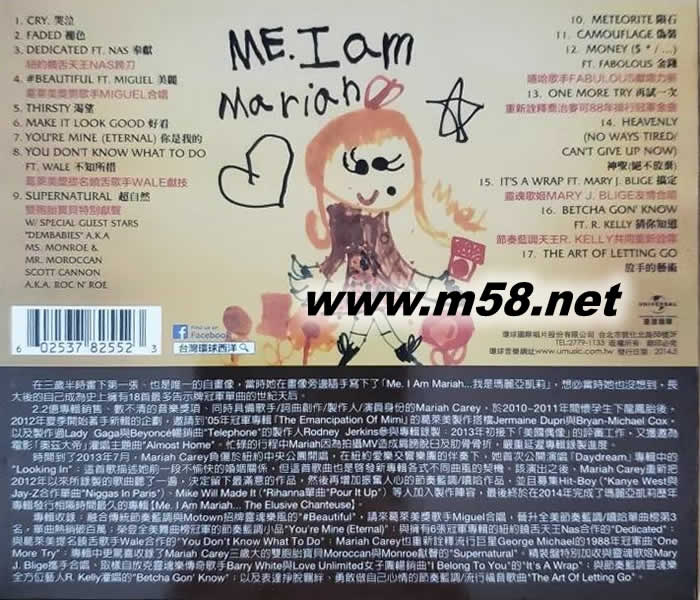 Me. I Am Mariah聽我...歌情萬種【精裝盤】(m58.net) 聽...史上擁有最多告示牌冠軍天后, 睽違5年第14張全新天碟 ★全新天后:世界頂尖製作Rodney Jerkins, Jermaine Dupri, Hit Boy等量身打造 ★沒有極限萬種風情:Nas, Wale, Miguel跨刀合唱,以及天后雙胞胎首度獻聲 ★精裝盤加收3首超值曲目,包括與靈魂歌姬Mary J. Blige、節奏藍調天王R. Kelly全新合作曲,以及動人單曲"The Art Of Letting Go" 在三歲半時畫下第一張、也是唯一的自畫像,當時她在畫像旁邊隨手寫下了「Me. I Am Mariah...我是瑪麗亞凱莉」,想必當時她也沒想到,長大后的自己成為史上擁有18首最多告示牌冠軍單曲的世紀天后。2.2億專輯銷售、數不清的音樂獎項、同時具備歌手/詞曲創作/製作人/演員身份的Mariah Carey,於2010~2011年間懷孕生下龍鳳胎后,2012年夏季開始著手新輯的企劃,邀請到’05年冠軍專輯『The Emancipation Of Mimi』的葛萊美製作搭檔Jermaine Dupri與Bryan-Michael Cox,以及製作過Lady Gaga與Beyoncé暢銷曲"Telephone"的製作人Rodney Jerkins參與專輯錄製;2013年初接下「美國偶像」的評審工作,又獲邀為電影「奧茲大帝」灌唱主題曲"Almost Home"。忙碌的行程中Mariah因為拍攝MV造成肩膀脫臼及肋骨骨折,嚴重延遲專輯錄製進度。 時間到了2013年7月,Mariah Carey負傷於紐約中央公園開唱,在紐約愛樂交響樂團的伴奏下,她首次公開演唱『Daydream』專輯中的"Looking In";這首歌描述她前一段不愉快的婚姻關係,但這首歌曲也是啟發新專輯各式不同曲風的契機。該演出之后,Mariah Carey重新把2012年以來所錄製的歌曲聽了一遍,決定留下最滿意的作品,然后再增加振奮人心的節奏藍調/嘻哈作品,並且募集Hit-Boy(*Kanye West與Jay-Z合作單曲"Niggas In Paris")、Mike Will Made It(*Rihanna單曲"Pour It Up")等人加入製作陣容,最后終於在2014年完成了瑪麗亞凱莉歷年專輯發行相隔時間最久的專輯【Me. I Am Mariah... The Elusive Chanteuse】。專輯收錄:融合傳統節奏藍調與Motown招牌靈魂樂風的"#Beautiful",請來葛萊美獎歌手Miguel合唱,晉升全美節奏藍調/嘻哈單曲榜第3名,單曲熱銷破百萬;榮登全美舞曲榜冠軍的節奏藍調小品"You're Mine (Eternal)";與擁有6張冠軍專輯的紐約饒舌天王Nas合作的"Dedicated";與葛萊美提名饒舌歌手Wale合作的"You Don't Know What To Do";Mariah Carey也重新詮釋流行巨星George Michael的1988年冠軍曲"One More Try";專輯中更驚喜收錄了Mariah Carey三歲大的雙胞胎寶貝Moroccan與Monroe獻聲的"Supernatural"。精裝盤特別加收與靈魂歌姬Mary J. Blige攜手合唱、取樣自放克靈魂樂傳奇歌手Barry White與Love Unlimited女子團暢銷曲"I Belong To You"的"It's A Wrap";與節奏藍調靈魂樂全方位藝人R. Kelly灌唱的"Betcha Gon' Know";以及表達掙脫羈絆、勇敢做自己心情的節奏藍調/流行福音歌曲"The Art Of Letting Go"。