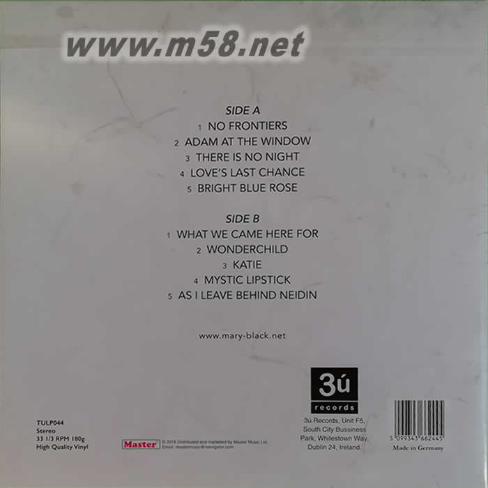 CARTHY 寫(xiě)我情深 黑膠(m58.net) 在愛(ài)爾蘭音樂(lè)熱衷者的眼中,愛(ài)爾蘭傳奇人物瑪麗·布萊克一直是世界上最出色的女歌手之一。 由都柏林的民歌俱樂(lè)部起步,瑪麗·布萊克在其備受矚目的20年音樂(lè)生涯中成功發(fā)行了9張白金銷量的獨(dú)唱專輯,其中包括居愛(ài)爾蘭音樂(lè)榜前30位長(zhǎng)達(dá)56星期的《No Frontiers》(《無(wú)邊界》)。瑪麗·布萊克理所當(dāng)然地成為愛(ài)爾蘭音樂(lè)史上的先驅(qū)人物,使愛(ài)爾蘭音樂(lè)在世界舞臺(tái)上綻放。 1983年,瑪麗發(fā)行了個(gè)人第一張同名專輯。這張專輯曾一度升到愛(ài)爾蘭唱片榜第4,是80年代初愛(ài)爾蘭最佳唱片之一。這張唱片為她成績(jī)斐然的歌唱生涯贏得了第一個(gè)音樂(lè)獎(jiǎng)項(xiàng)——愛(ài)爾蘭獨(dú)立藝術(shù)獎(jiǎng)。 與傳統(tǒng)樂(lè)隊(duì)“地丹南”樂(lè)隊(duì)成功合作之后,瑪麗和制作人兼吉他手迪克蘭·斯諾特再度聯(lián)手錄制了第二張唱片——《Without Fanfare》(《沒(méi)有喇叭聲》)。這張唱片確立了瑪麗式的商標(biāo):善于發(fā)現(xiàn)愛(ài)爾蘭當(dāng)代優(yōu)秀的詞曲作者,并用自己獨(dú)特的嗓音把這些歌帶上世界歌壇。《舊金山紀(jì)事》稱她為“世界上最出色的詮釋歌手之一”。