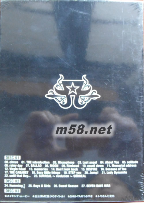 <DISC-1> 00. circus 01. THE introduction 02. Microphone 03. Last angel 04. About You 05. solitude 06. rainy day 07. BALLAD 08. MOON 09. Rimbaud 10. count down 11. Memorial address 12. Virgin Road 13. memories 14. Don't look back 15. INSPIRE 16. Because of You 17. THE CABARET 18. Sexy little things 19. STEP you 20. Jump! 21. Lady Dynamite 22. until that Day... 23. SURREAL ~ evolution ~ SURREAL <DISC-2> 24. Humming 7/4 25. Boys & Girls 26. Sweet Season 27. SEVEN DAYS WAR ★特典影像:幕后花絮影片 <DISC-3> ★幕后製作花絮影片 ★全公演MC集(全40段) ★SHU-YA的小品集 ★Tomo先生的七變化