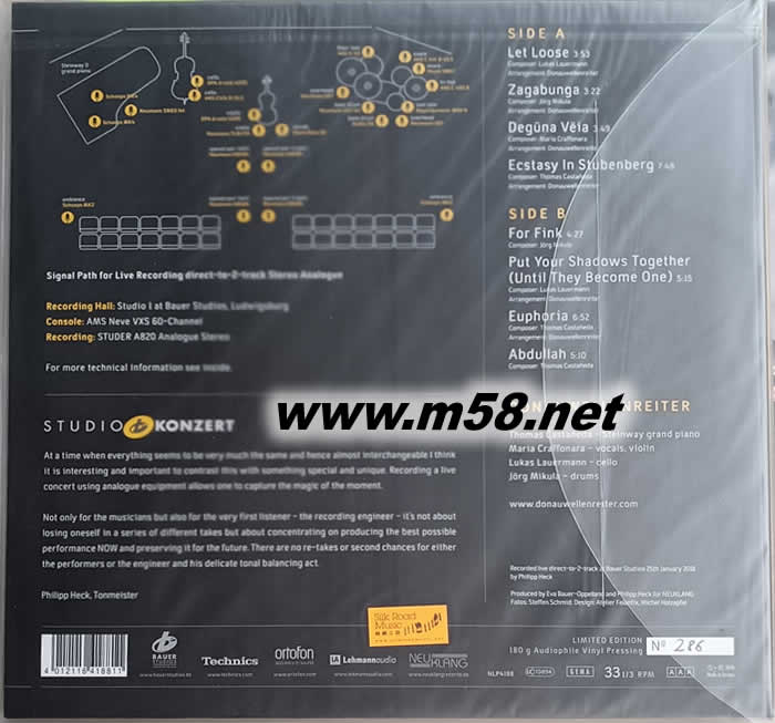 (AAA立體聲VOL.34)多瑙河沖浪者四重奏Studio Koncert :Donauwellenreiter爵士 黑膠 限量版(m58.net) Thomas Castañeda Steinway grand piano (鋼琴) Maria Craffonara (女聲、小提琴) Lukas Lauermann (大提琴) Jörg Mikula (鼓) 最接近原音的純模擬製作—Studio Konzert黑膠系列 由現場錄音,直接入兩軌模擬錄音臺(Direct-To-2-Track) 至母盤制作整個過程全是模擬制作(AAA),全球限量發行1000套編號版 1. 被寓為最具創意,每次演出皆令樂迷振奮莫明的奧地利現代爵士樂團"多瑙河衝浪者"四重奏(Donauwellenreiter),他們四個成員無論是作曲或演奏技術皆有出色的表現,在歐洲多國和加拿大受到不少爵士樂迷盛大歡迎,備受讚賞。 2. 樂隊於2018年1月在位於德國路德維希堡(Ludwigsburg)最具悠久歷史,極負盛名之「博耳」錄音室(Bauer Studio)進行了一場與樂迷最正面接觸的迷你音樂會,演繹全是他們自己的創作作品包括令樂隊推到高峰由鋼琴手托馬斯‧卡斯塔涅達(Thomas Castañeda)於2016年所作的"欣快異常(Euphoria)",現時即興的出色演出同時作純模擬黑膠盤實況錄音的製作,整個音樂會全程不能出錯,接受最高難度的挑戰。 3. 這音樂會內的歌曲全是爵士樂,個別地融入一些民謠、流行曲、古典樂或世界音樂等元素,旋律優美感性,節奏明快,充滿活力,但音色柔美亮澤,令人著迷。 4. 四位成員各身懐絕技,演出經驗豐富,他們的演奏充滿動力,節奏感十足,即興時的全情投入和互相啟發,演出一氣呵成,精彩絕倫。 5. 以最接近原音的純模擬製作,將現場演奏的拾音直接入兩軌錄音臺(Direct-To-2-Track)至母盤製作整個過程全是原汁原味,不作任何修改和調整,絕是最傳真的(AAA) 製作,加上全球限量發行1000套編號版,更屬珍貴。