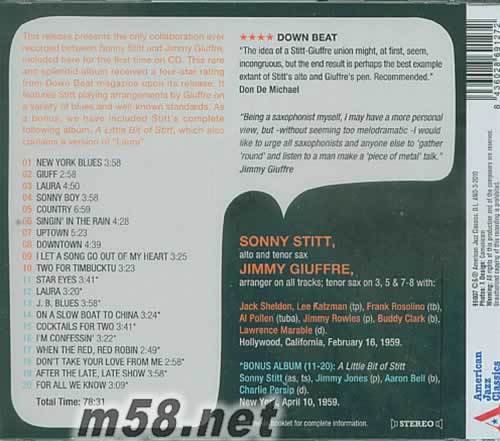Sonny Stitt Plays Jimmy Giuffre Arrangements(m58.net) The idea of a Stitt-Giuffre union might, at first, seem incongruous; but listen to the virile alto Stitt’s playing against the understated background of Giuffre’s arrangements, and the effect is electrifying. Stitt is the only soloist on the sides with the brass choir, and he maintains a high level of performance throughout. Giuffre attains an effect of a larger group by his imaginative use of contrary motion and dissonance. His writing for bass and tuba adds much to the fullness and novelty of the arrangements. In contrast to the arranged sides, Giuffre joins Stitt and the rhythm section for two blues, Down Country and Uptown, but even on these, the basic difference in conception of the two men is evident—tension Vs. relaxation. This album achieves this contrast to a remarkable degree.