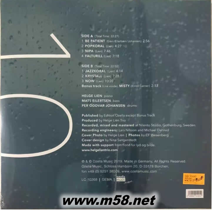 海格第10張專輯 爵士三重奏 鋼琴、低音大提琴、鼓 [10] 黑膠(m58.net) Helge Lien (piano)、 Knut Hem (Dobro/Weissenborn) 1. 飲譽國際,獲得多個重要音樂獎項包括【挪威格萊美年度最佳爵士樂專輯(Spellemannprisen - Best Jazz Album)】,被譽為爵士樂界的奇葩,來自挪威的「海格·連三重奏(Helge Lien Trio)」的最新專輯《10》整好是樂隊跟以精製高水平錄音見稱的德國「奧塞勒(Ozella)」合作出版的第十個專輯,一個新的里程碑。 2. 這專輯藴含三個新的元素,創隊成員低音大提琴手弗迪‧伯格(Frode Berg)離隊作個人發展,空缺由現時在北歐極受歡迎的邁斯‧艾利森(Mats Eilertsen)替代。隨著這一改變,樂隊製作此專輯亦離開他們慣性地工作了十五年在奧斯陸的彩虹錄音室(Rainbow Studio, Oslo)轉到新的工作室進行,不同的器材設備和音響設計便能產生不同的錄音效果。加上海格·連投入不少新的音樂概念和演繹方法,這專輯就是樂隊新形像的投射。 3. 從第一曲《請耐心些(Be Patient》海格·連以他的拿手好戲 - 晶瑩剔透,流暢清勁如瀑布般的鋼琴演奏開始,除除引入艾利森滿佈神秘魔力的低音大提琴,這個音樂引子就像充滿詩意的迷人音畫,帶領眾人進入一個美麗景像密佈的優雅音樂旅程。 4. 每首樂曲在合奏時三位成員的演奏皆令人矚目,音色柔美,充滿亮澤,緊湊的融合卻容易識別他們個別的表現和位置。在獨奏樂曲,個人的演奏技術和風格更為突出,吸引力更強。 5. 精湛的錄音技術,令人讚嘆的演奏,將充滿映像的“新室內樂”從容優雅地展現,配合以180克,金屬直刻母盤壓製處女黑膠唱片為載體,是此樂種示范盤之一。
