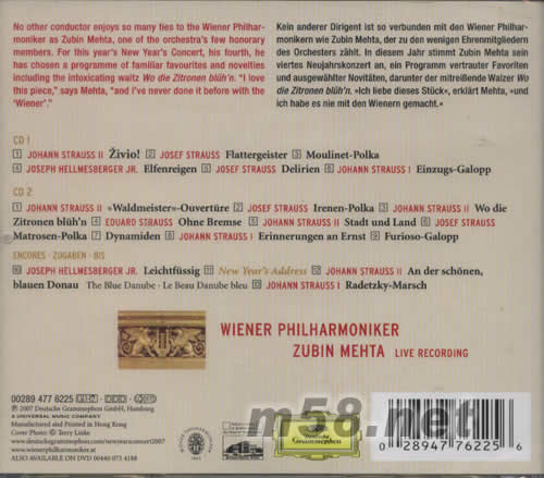 2007維也納新年音樂會 一年一度金色大廳音樂圣宴 美國肯尼迪中心榮譽(yù)得獎指揮 梅塔Zubin Mehta再度率領(lǐng)維也納愛樂演繹 18首史特勞斯嫡系華爾茲名作