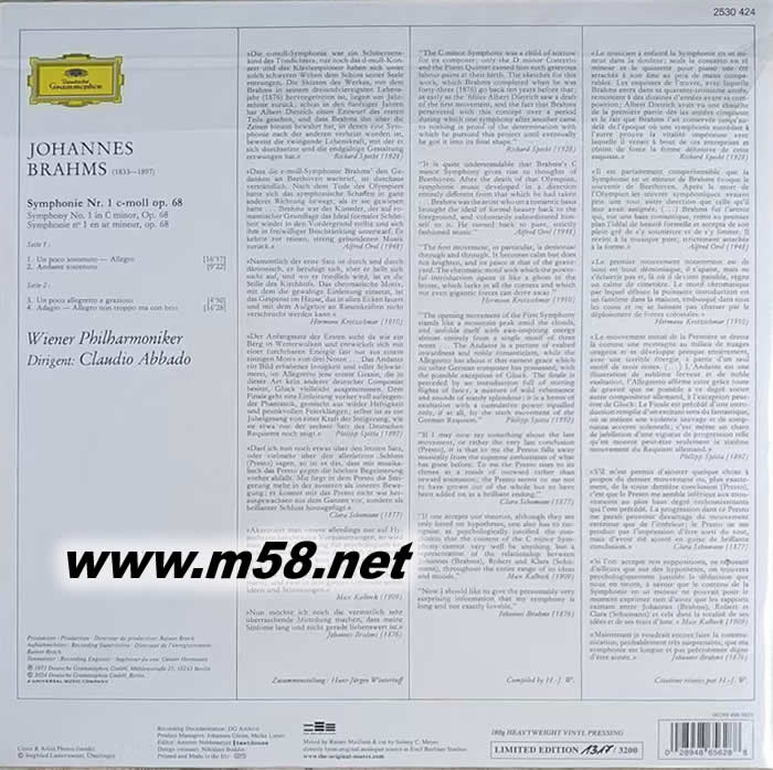 CLAUDIO ABADO JOHANNES BRAHMS SYMPHONIE NR 1 黑膠(DG唱片125周年紀念版 藍膠) 限量版專輯背面圖片