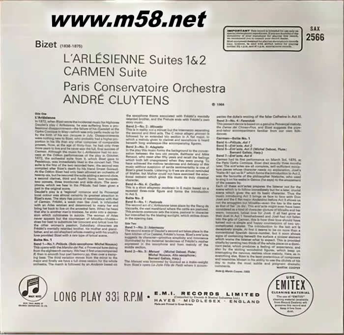 比才 卡門組曲 / 阿萊城姑娘組曲CARMEN EARLESIENNE (no. 1 & no.2)180g 33RPM LP 黑膠(m58.net) 克路易坦 (Andre Cluytens) 指揮 巴黎音樂院管弦樂團 古典&音響發燒友爭相收藏之經典銘版 EMI原廠母帶(1964年)精心轉制, 英國原裝進口 (註)立體聲錄音技術誕生於1954年;EMI的早期 立體聲錄音效果驚人:動態、音場、定位皆絕佳 !!