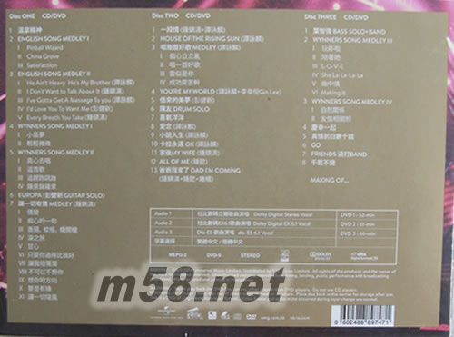 DVD3特別附錄:Making of (15:28) DVD-9 可選音效播放效果:1.杜比數碼立體歌曲演唱 Dolby Digital Stereo Vocal 2.杜比數碼EX6.1歌曲演唱 Dolby Digital Ex 6.1 Vocal 3.Dts-ES歌曲演唱dts-ES 6.1 Vocal 字幕可選:繁體中文 / 簡體中文