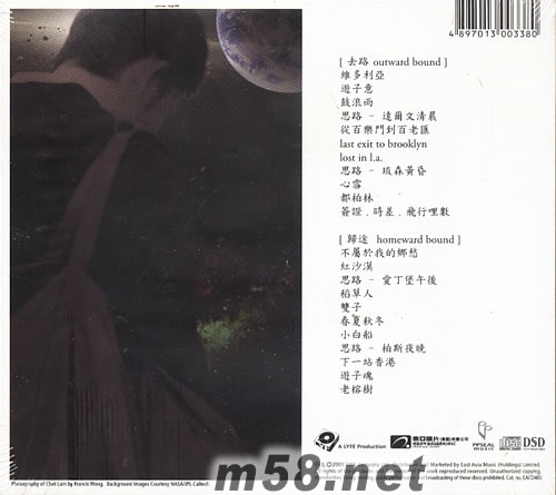 CD 1 去路 outward bound 01. 維多利亞 02. 游子意 03. 鼓浪雨 04. 思路 - 達爾文清晨 05. 從百樂門到百老匯 06. last exit to brooklyn 07. lost in L.A. 08. 思路 - 琉森黃昏 09. 心雪 10. 都柏林 11. 簽證.時差.飛行哩數(shù) CD 2 歸途 homeward bound 01. 不屬于我的鄉(xiāng)愁 02. 紅沙漠 03. 思路 - 愛丁堡午后 04. 稻草人 05. 雙子 06. 春夏秋冬 07. 小白船 08. 思路 - 柏斯夜晚 09. 下一站香港 10. 游子魂 11. 老榕樹