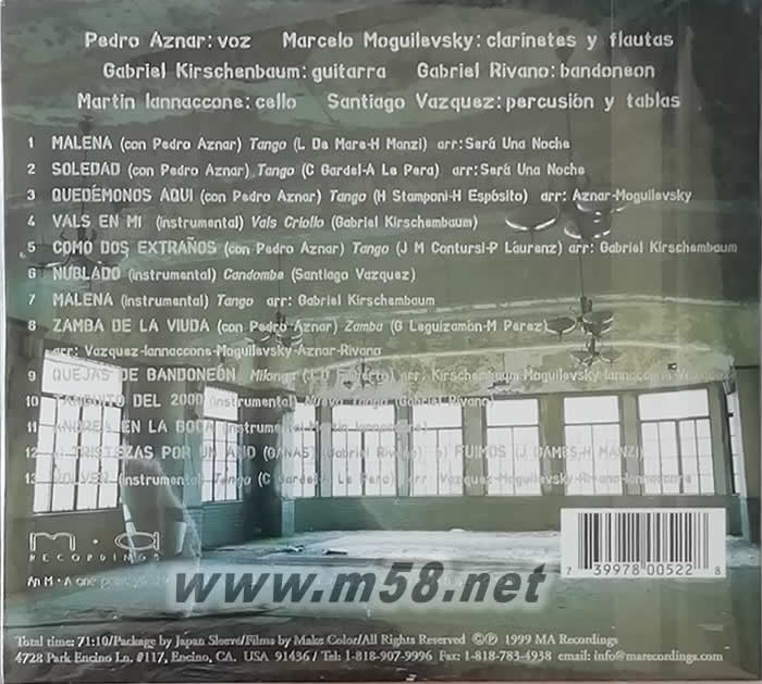 1. Malena (Tango) 2. Soledad (Tango) 3. Quedemonos Aqui (Tango) 4. Vals En Mi (Vals Criollo) 5. Como Dos Extranos (Tango) 6. Nublado (Instrumental) (Candombe) 7. Malena (Instrumental) (Tango) 8. Zamba De La Viuda (Zamba) 9. Quejas De Bandoneon (Milonga) 10. Tanguito Del 2000 (Instrumental) (Nuevo Tango) 11. Andrea En La Boca (Instrumental) 12. Tristezas Por Un Ano (Ganas)/Fuimos 13. Volver (Instrumental) (Tango)