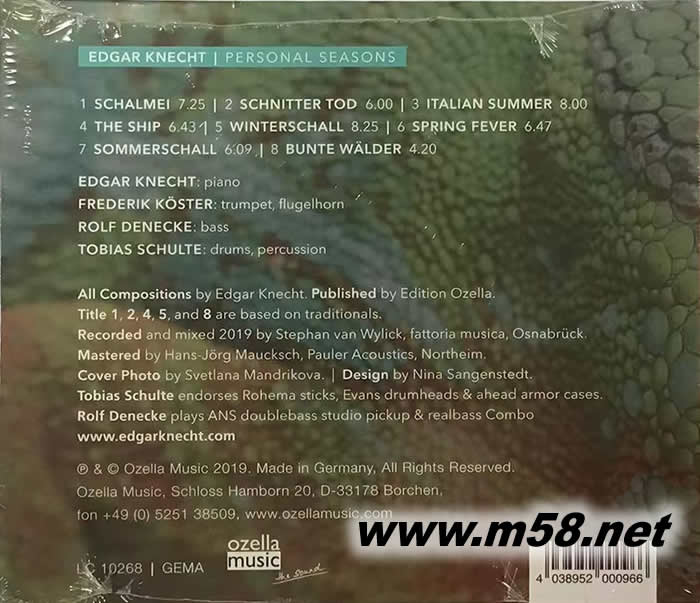 1. 埃德加‧尼赫特(Edgar Knecht)是德國現(xiàn)今最具音樂天份和創(chuàng)意的鋼琴爵士樂的演奏家和作曲家,他從十四歲開始已公開演奏自己的作品,獲得好評如潮,從此在歐洲樂壇踏上青云之路,跟著獲獎無數(shù),備受歡迎。 2. 尼赫特最為人稱頌的是改編德國民歌以鋼琴爵士樂演奏,將傳統(tǒng)民俗文化融入現(xiàn)代表演藝術之中,這一創(chuàng)舉令他在古巴夏灣拿的爵士樂音樂節(jié)中大放異彩,贏得無盡掌聲和喝采。他亦以此方針製作了《利洛費早晨(Good Morning Lilofee)》和《在水深處舞動(Dance On Deep Waters)》兩個專輯,極受歡迎,現(xiàn)再接再勵,第三個專輯《個人季節(jié)(Personal Seasons)》再挑選了四首傳統(tǒng)民歌和三首他個人與四個季節(jié)有關的歌曲改編成鋼琴爵士樂四重奏,予人有美不勝收的效果。 3. 尼赫特與低音結(jié)他手羅爾夫‧丹歷克(Rolf Denecke)和鼓手托比亞斯‧舒爾特(Tobias Schulte)組成的三重奏合作多年,心領神會的默契加上超卓的演奏技巧,每次演出必大放異彩。這次他們更邀請德國著名爵士樂小號手弗雷德里克‧科斯特(Frederik Köster)參與製作此專輯,成為四重奏的演繹使原本旋律純樸優(yōu)雅的歌曲更為色彩豐盈,明亮淳美。 4. 尼赫特的鋼琴演奏更為嫻熟清跪,感性中帶著優(yōu)雅,流暢自然,配合科斯特氣量充沛,順滑如絲,線條分明的小號和夫呂號吹奏與丹歷克沉實富彈性的低音大提琴和舒爾特延伸能力非凡的敲擊,加上他們?nèi)缛牖车幕樱攘κ愕难葑嗔钊藘A心。 5. 此錄音製作由以模擬錄音(analog recording)馳名,位於德國奧斯納布呂克(Osnabrück)的法托里亞錄音室(Fattoria Musica)著名錄音師斯蒂芬·范·威利克(Stephan van Wylick)負責錄音和混音工序,而直刻金屬母盤(Direct Metal Mastering)由《老虎魚》工程師漢斯-約爾格•莫斯克斯(Hans-Joerg Maucksch)負責操刀, 以180克處女膠唱片為載體, 並顯赫的專業(yè)技術,聲音更精準,更自然,更富立體感,是另一鋼琴爵士樂四重奏的黑膠唱片示范盤。