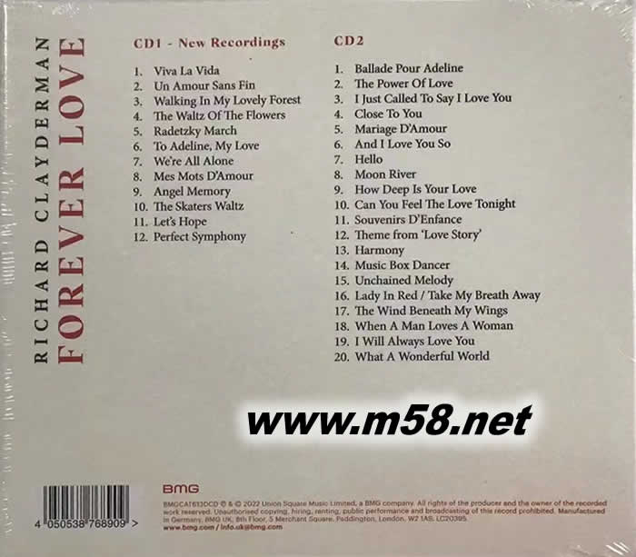 永遠的愛 FOREVER LOVE(m58.net) 理查德克萊德曼被譽為有史以來最成功的鋼琴家之一,他發行了一張專輯,其中包含十二張新唱片,這些唱片是在去年全球大流行期間制作的。這張專輯以優美的現代經典作品為特色,包括酷玩樂隊的“Viva La Vida”和 Ed Sheeran 的“完美交響曲”,以及最受歡迎的經典作品“The Waltz of the Flowers”和“The Radetzky March”,以及理查德克萊德曼長期創作的四首新原創作品1977 年簽名唱片“Ballade Pour Adeline”的合作者和作曲家 Paul de Senneville。除了新唱片之外,還有他最喜愛和最受歡迎的鋼琴演奏的經久不衰的收藏,這無疑是理查德克萊德曼唱片的權威收藏 - 是送給您生命中特殊伴侶或父母的理想禮物。被南希•里根稱為“浪漫王子”,理查德克萊德曼的職業生涯跨越了六年。在此期間,他已在全球售出超過 9000 萬張專輯,并以他標志性的浪漫風格錄制了 1,400 多首歌曲,包括原創作品以及世界各地喜愛的古典和流行標準的廣泛曲目。