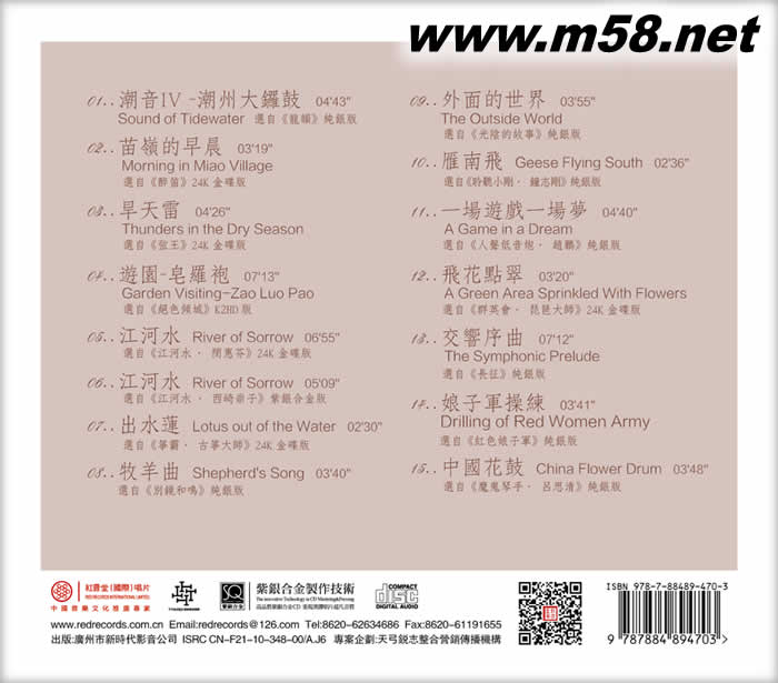 01..潮音IV -潮州大鑼鼓 選自《龍韻》 純銀版 04'43'' Sound of Tidewater 02..苗嶺的早晨 選自《醉笛》 24K金碟版 03'19'' Morning in Miao Village 03..旱天雷 選自《弦王》24K金碟版 04'26'' Thunders in the Dry Season 04..游園-皂羅袍 選自《絕色傾城》 K2HD版 07'13'' Garden Visiting-Zao Luo Pao 05..江河水 選自《江河水·閔惠芬》24K金碟版 06'55'' River of Sorrow 06..江河水 選自《江河水·西崎崇子》紫銀合金版 05'09'' River of Sorrow 07..出水蓮 選自《箏霸·古箏大師》 24K金碟版 02'30'' Lotus out of the Water 08..牧羊曲 選自《別鏡和鳴》 純銀版 03'40'' Shepherd's Song 09..外面的世界 選自《光陰的故事》 純銀版 03'55'' The Outside World 10..雁南飛 選自《聆聽小剛·鐘志剛》 純銀版 02'36'' Geese Flying South 11..一場游戲一場夢 選自《人聲低音炮·趙鵬》 純銀版 04'40'' A Game in a Dream 12..飛花點翠 選自《群英會·琵琶大師》 24K金碟版 03'20'' A Green Area Sprinkled With Flowers 13..交響序曲 選自《長征》 紫銀合金 07'12'' The Symphonic Prelude 14..娘子軍操練 選自《紅色娘子軍》 純銀版 03'41'' Drilling of Red Women Army 15..中國花鼓 選自《魔鬼琴手·呂思清》 純銀版 03'48'' China Flower Drum