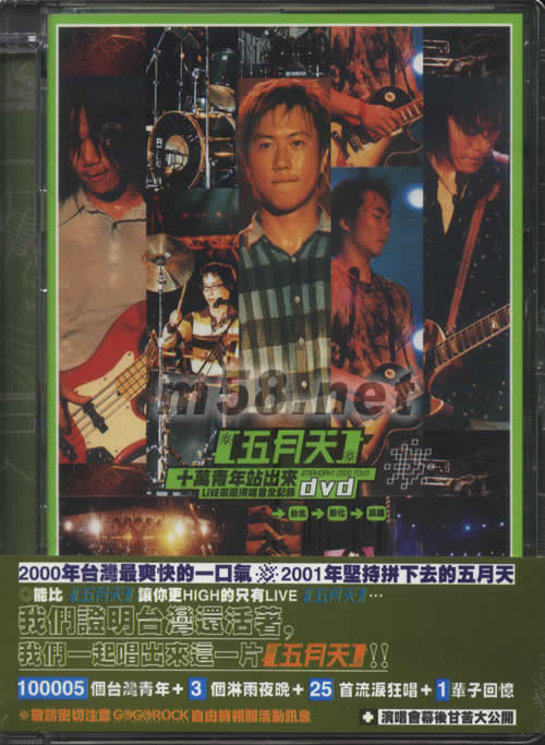 十萬青年站出來-Live巡回演唱會全記錄DVD(m58.net) 單面雙層 隱藏式KARAOKE DVD給你更多更好的享受 AC-3 5.1 Chinnel>>享受百分白現場感覺 隱藏式卡拉OK功能>>與五月天一起唱翻天 多角度選擇功能>>讓你看到不一樣的五月天