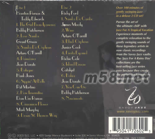 價格為估,以實到貨為準! 假日情懷JAZZ FOR A TPOPICAL VACATION(m58.net) DENON 旗下SAVOY JAZZY 變CD套裝精選,輯錄多首熱鬧輕快作品,全部名師演繹。THE GIRL FROM IPANEMA ,SAMBA DE PRPHEUS WAVE 等名曲伴你渡過這個悠親假日。重新混音推出,原裝美國進口,變碟物價推出。
